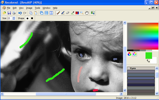 La segunda herramienta es Recolored (ví­a Fotografí­as.net)  una aplicación comercial de escritorio (a partir de 20€) pero que puedes probar durante 21 dí­as y que sirve justo para todo lo contrario. Si necesitas colorear una fotografí­a simplemente escoges de la biblioteca algún color para la piel, le das un brochazo a la cara del sujeto, para el pelo, ojos y cielo igual. Es decir, lo que te ahorras es la selección cuidadosa de las partes, Recolored selecciona mediante el contraste y aplica el color que tú indiques en modo «Color» pero todo esto sin capas ni selecciones. También puedes partir de una imagen en color y usar Recolored para reemplazar el color.