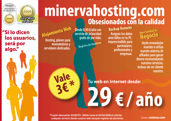Ya os he hablado en varias ocasiones de Minerva Hosting, premiado por los usuarios como mejor sitio de alojamientos web los últimos dos años. Además de escogerles para mi y para mis clientes por las buenas referencias os confirmo la calidad de sus servicios, su soporte activo 24 horas, 365 días al año, y los planes adaptados a todas las necesidades.
